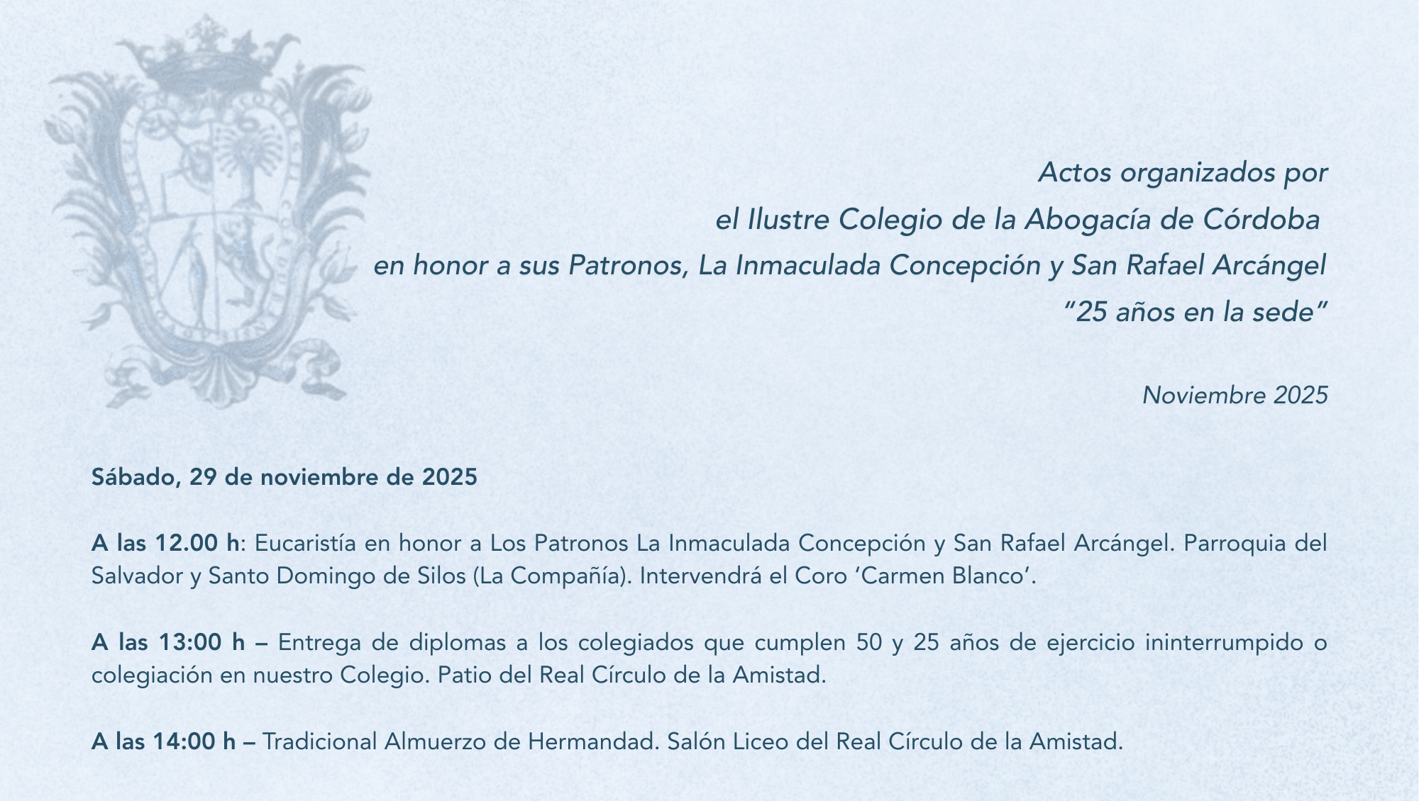 Las tarjetas de asistencia a la Comida de Hermandad pueden ser retiradas en la Secretaría del Colegio y en la Sala de Togas, hasta el próximo miércoles, 26 de noviembre incluido, al precio de sesenta euros, y de cuarenta y cinco para la Abogacía Joven.