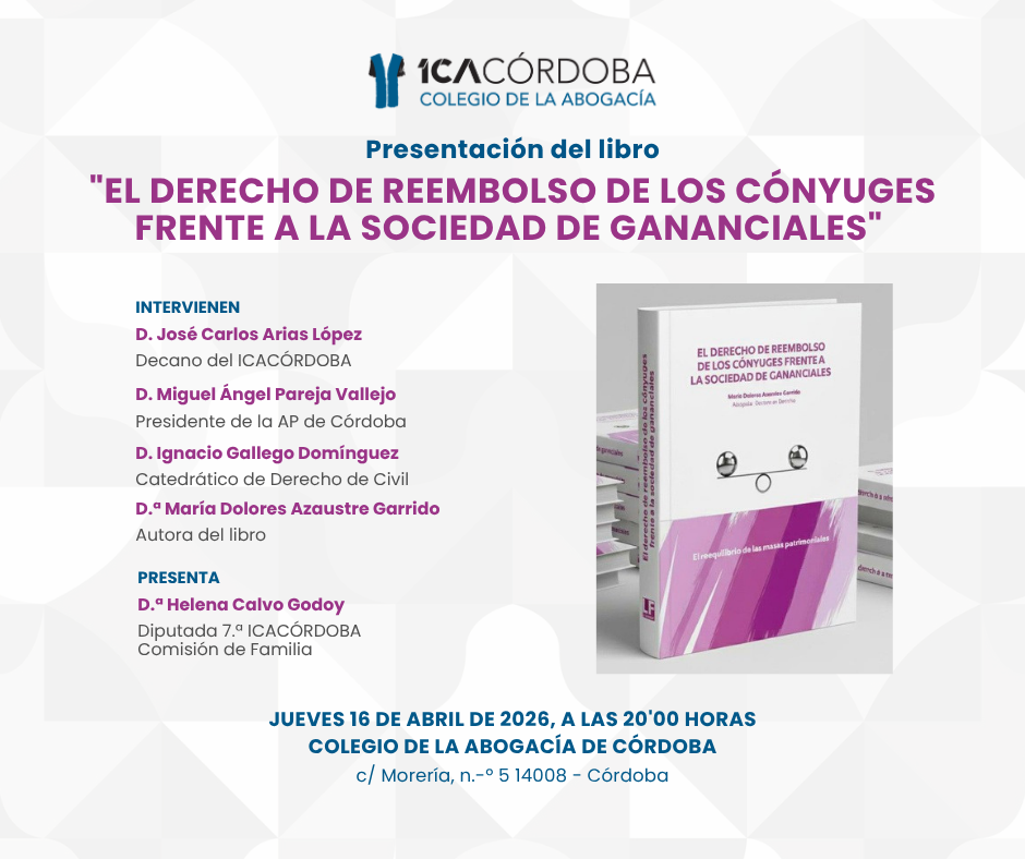 El Colegio de la Abogacía de Córdoba acogerá el próximo jueves, 16 de abril de 2026, a las 20:00 horas, en su sede, la presentación del libro “El derecho de reembolso de los cónyuges frente a la sociedad de gananciales”, obra de María Dolores Azaustre Garrido, abogada y doctora en Derecho.