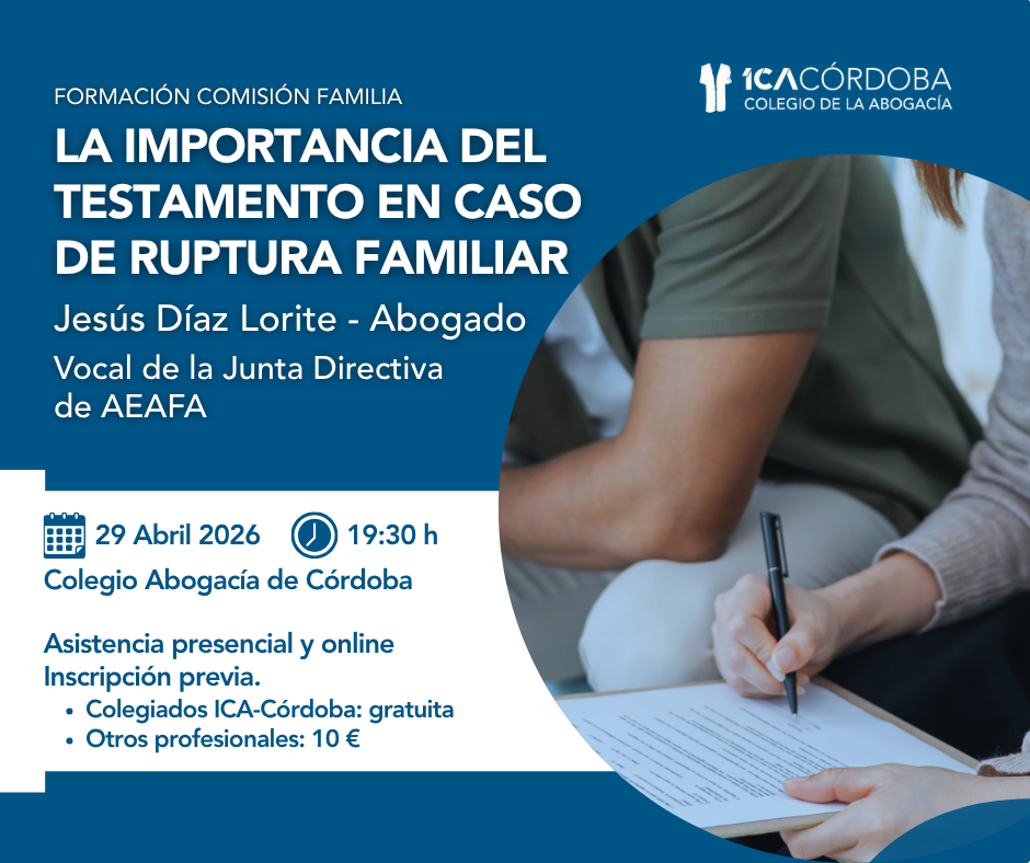 La conferencia será impartida por el abogado Jesús Díaz Lorite, miembro de la Comisión de Derecho de Familia y vocal de la Junta Directiva de la AEAFA en Córdoba, quien abordará las implicaciones prácticas y jurídicas del testamento en situaciones de ruptura, poniendo el foco en la protección de los intereses personales y familiares.